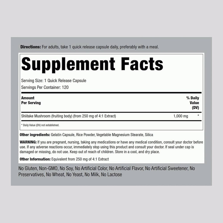 مکمل Shiitake Mushroom از برند معتبر Piping Rock حاوی عصاره خالص قارچ شیتاکه (Lentinus edodes) است که قرنها در طب سنتی آسیایی برای تقویت سیستم ایمنی، سلامت پوست و افزایش طول عمر مورد استفاده قرار گرفته است.