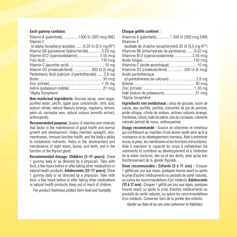 این محصول حاوی ویتامینها و مواد معدنی ضروری برای رشد، انرژی، ایمنی و سلامت عمومی کودک است و بهصورت پاستیلهای گیاهی با طعم پرتقال، تمشک و لیمو عرضه میشود.