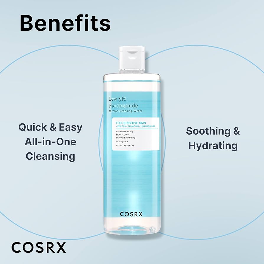 محلول پاککننده آرایش و آلودگی Low pH Niacinamide Micellar Cleansing Water از برند محبوب COSRX، یکی از بهترین انتخابها برای پوستهای حساس و مستعد جوش است.