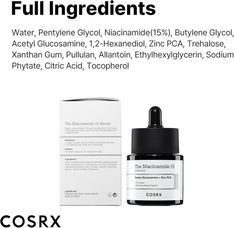 این فرمول با ۱۵٪ نیاسینامید خالص همراه با زینک PCA و استیل گلوکزامین ساخته شده تا ترشح سبوم را تنظیم کرده، التهاب را کاهش دهد و ظاهر پوست را صاف و مات کند.