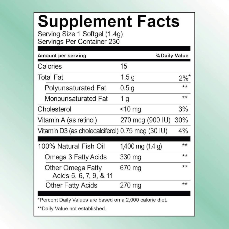 هر سافتژل حاوی ۱۴۰۰ میلیگرم روغن ماهی طبیعی با ۱۰۰۰ میلیگرم اسیدهای چرب اُمگا است که به حفظ سلامت قلب، مغز و مفاصل کمک میکند.