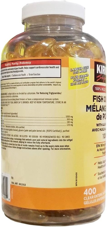 مکمل کپسول روغن ماهی کرکلند با روغن سالمون آلاسکایی ۱۰۰۰ میلیگرم (۴۰۰ عدد) از برند معتبر Kirkland Signature ترکیبی از روغن ماهی وحشی و روغن سالمون آلاسکایی است که در فرم طبیعی تریگلیسیرید (Natural Triglyceride Form) تولید میشود تا جذب و اثرگذاری بالاتری در بدن داشته باشد.