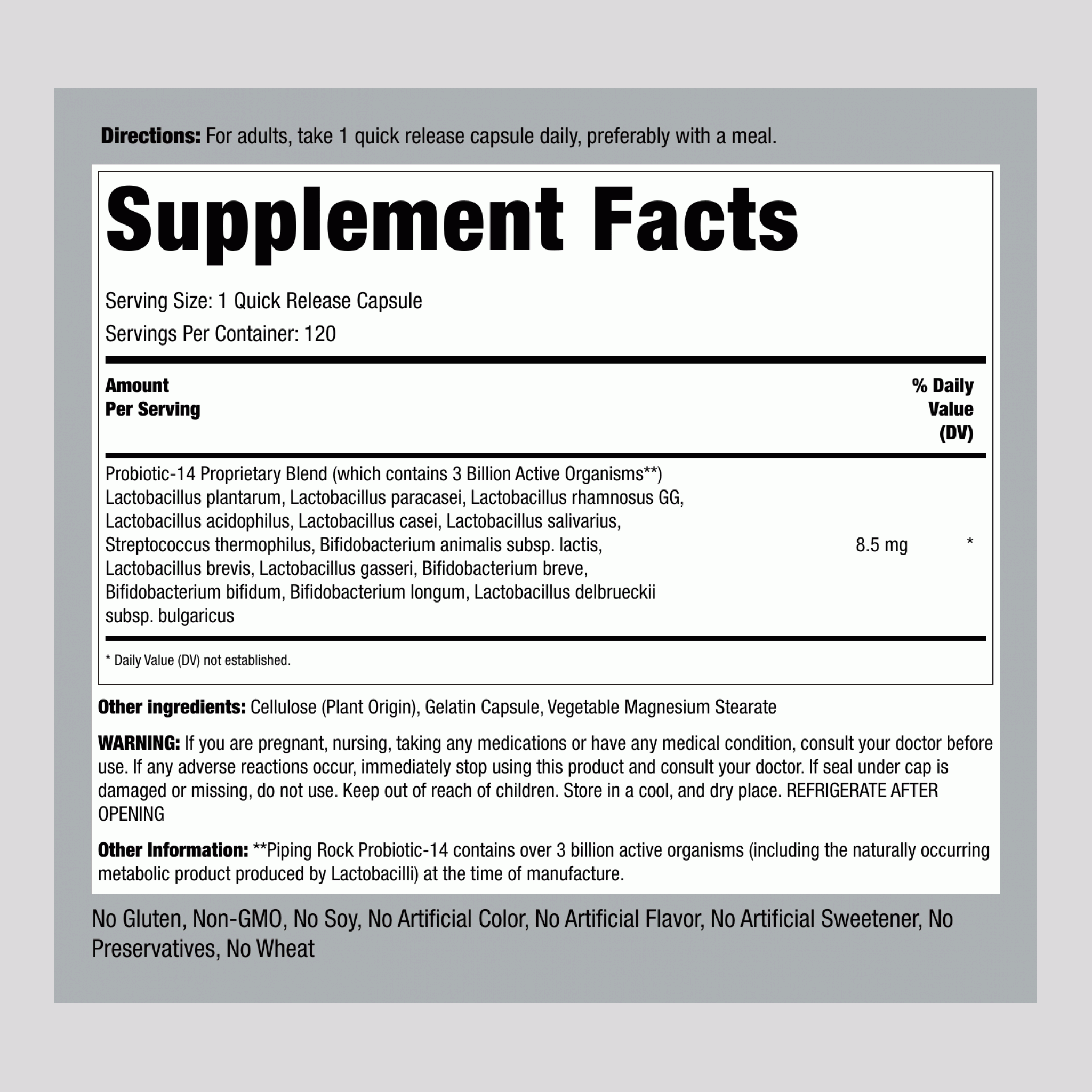 مکمل Probiotic Acidophilus از برند Piping Rock یک ترکیب قدرتمند از ۱۴ سویه پروبیوتیک فعال است که به بهبود سلامت گوارش، جذب بهتر مواد مغذی و تقویت سیستم ایمنی بدن کمک میکند.