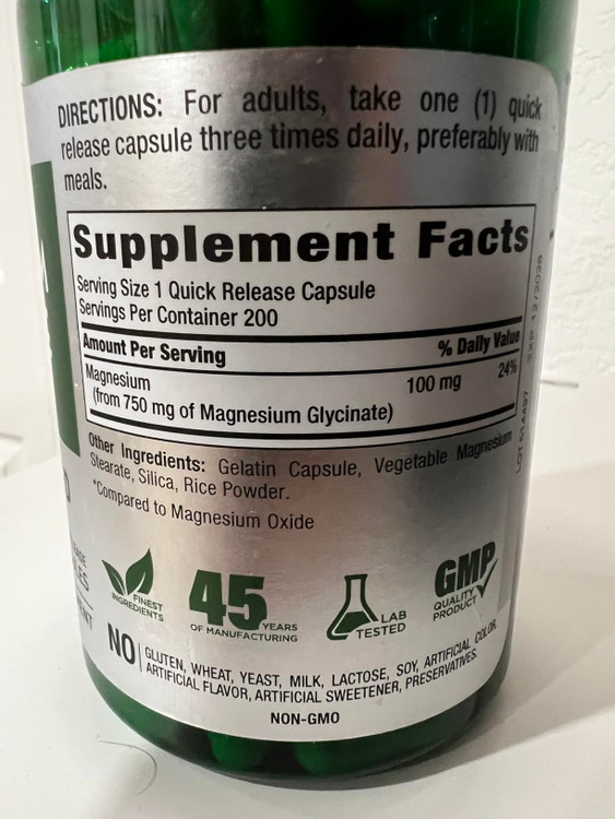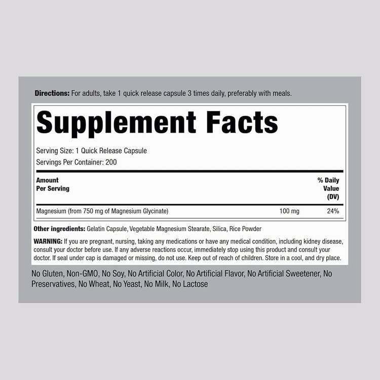 منیزیم گلیسینات پایپینگ راک | جذب بسیار بالا | 750mg | 200 کپسول