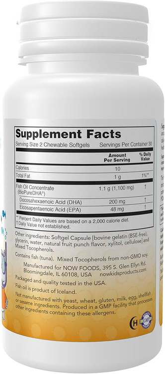 مکمل NOW Kids DHA Fish Oil Chewables یک منبع عالی از اسید چرب ضروری DHA برای رشد سالم مغز و سیستم عصبی کودکان است. این محصول به شکل سافتژلهای جویدنی و با طعم میوهای خوشمزه طراحی شده تا مصرف آن برای کودک آسان و لذتبخش باشد.
