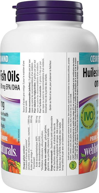 مکمل Omega-3 Webber Naturals با دوز ۱۰۰۰ میلیگرم در هر سافتژل، منبعی عالی از اسیدهای چرب ضروری EPA و DHA است که نقش مهمی در حفظ سلامت قلب، بهبود عملکرد مغز، کاهش التهاب بدن و سلامت چشمها دارند. این محصول با فرمول خالص و استاندارد، هضم آسان و جذب بالا، انتخابی مناسب برای تأمین روزانه امگا-۳ میباشد.