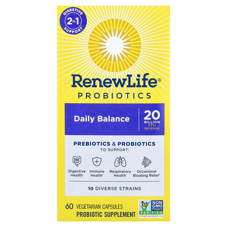 پروبیوتیک Daily Balance از برند معتبر RenewLife یک فرمول کامل شامل ۱۰ سویه پروبیوتیک فعال + پریبیوتیک است که برای مصرف روزانه طراحی شده و به بهبود سلامت گوارش، تقویت ایمنی و کاهش نفخ کمک میکند.