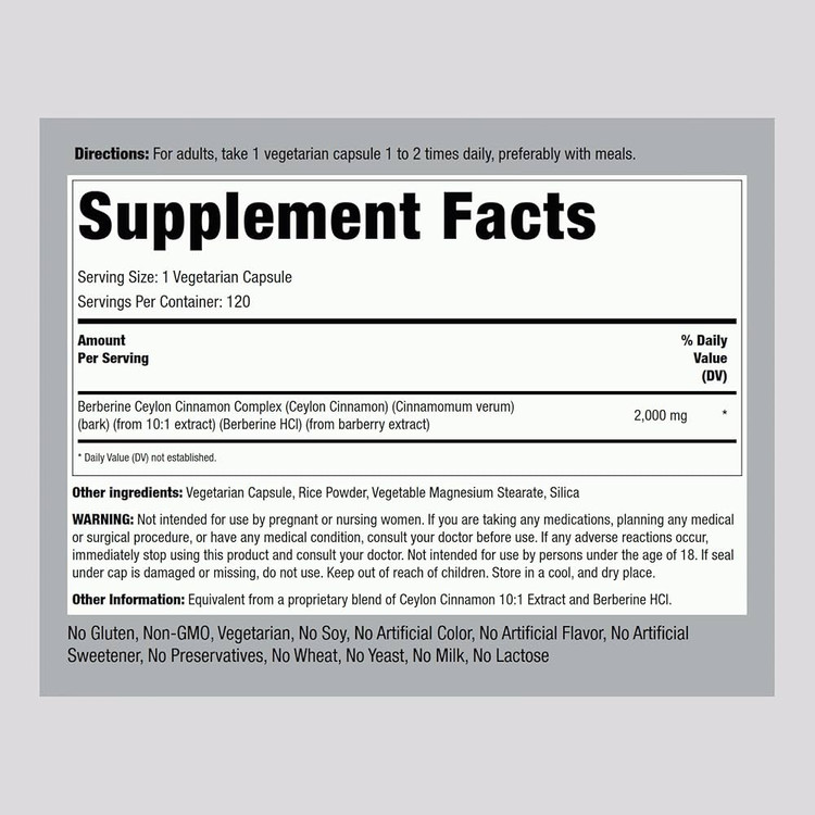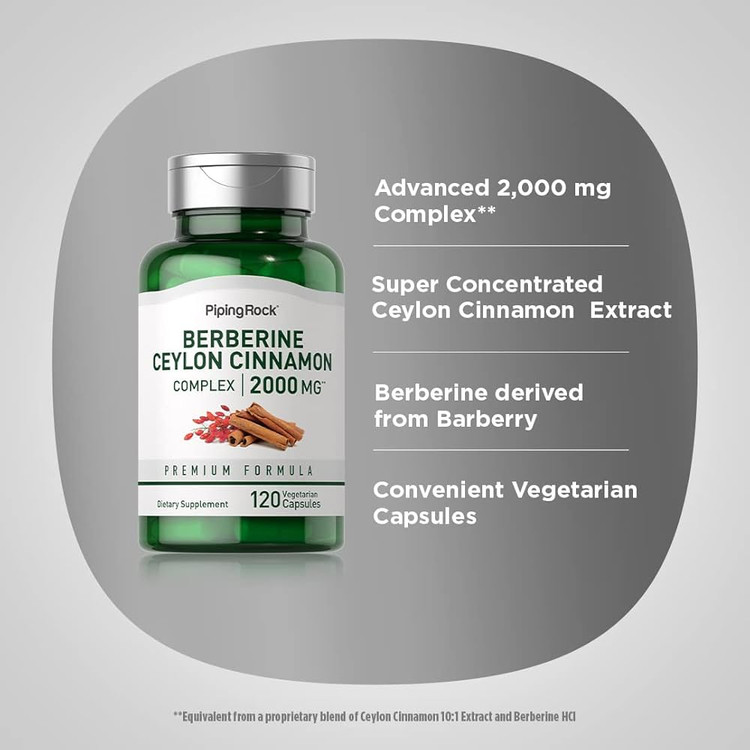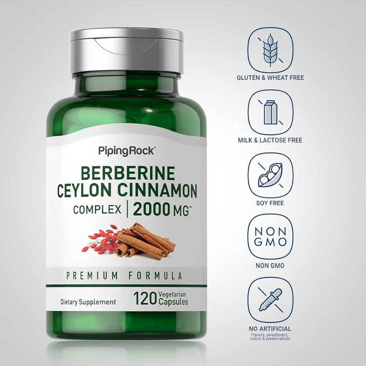 مکمل Berberine + Ceylon Cinnamon از برند Piping Rock یک ترکیب قدرتمند برای کنترل قند خون، بهبود حساسیت به انسولین، کمک به کاهش وزن و حمایت از سلامت متابولیسم است.